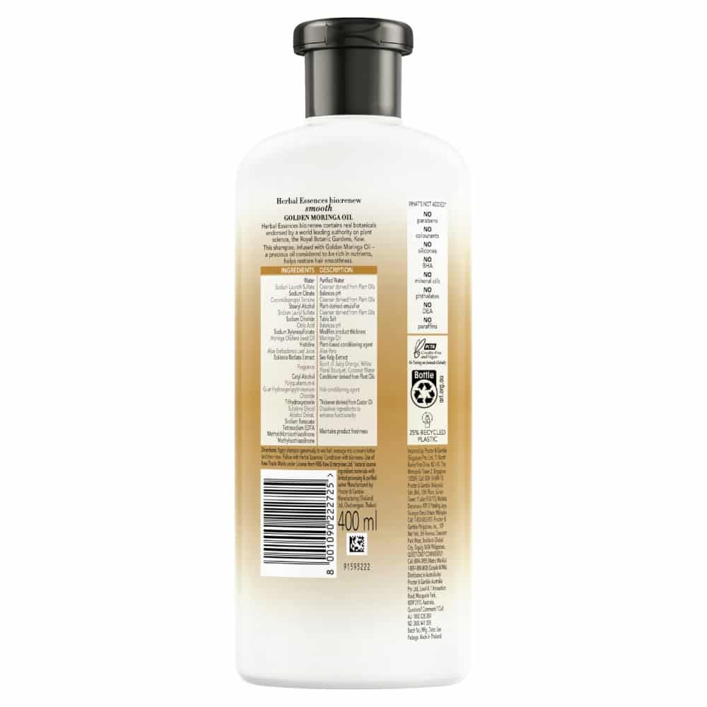Herbal Essences Golden Moringa Oil Smooth Shampoo (400 mL) is designed to provide nourishment and moisture to your hair, leaving it soft, smooth, and shiny. Below is a comprehensive breakdown of the product, including how to use it, the ingredients, and other relevant details.