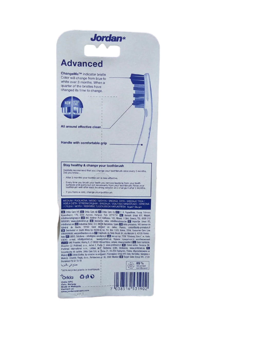 The JORDAN Advance Change Me Medium Toothbrush offers a revolutionary design for optimal oral hygiene. Its advanced bristle technology provides 50% more plaque removal compared to traditional toothbrushes. With easy-to-change brush heads, maintaining a hygienic routine has never been simpler.