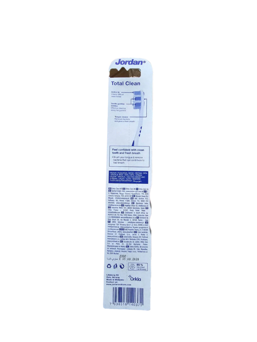 The JORDAN TOTAL CLEAN MEDIUM TOOTHBRUSH is a professional-grade toothbrush designed for optimal cleaning. Its medium bristles effectively remove plaque and debris, while the ergonomic handle ensures a comfortable and efficient brushing experience. With this toothbrush, you can achieve a healthier and brighter smile.
