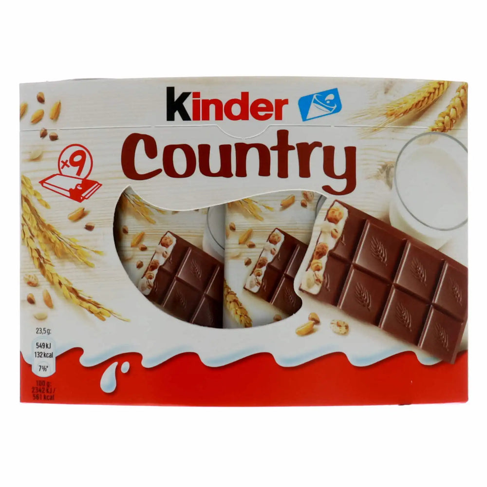Kinder Country contains a delicious milky filling and the great taste of a mix of 5 different crunchy cereals (barley, rice, wheat, spelt and buckwheat), simply puffed and toasted, all wrapped in a fine milk chocolate coating.