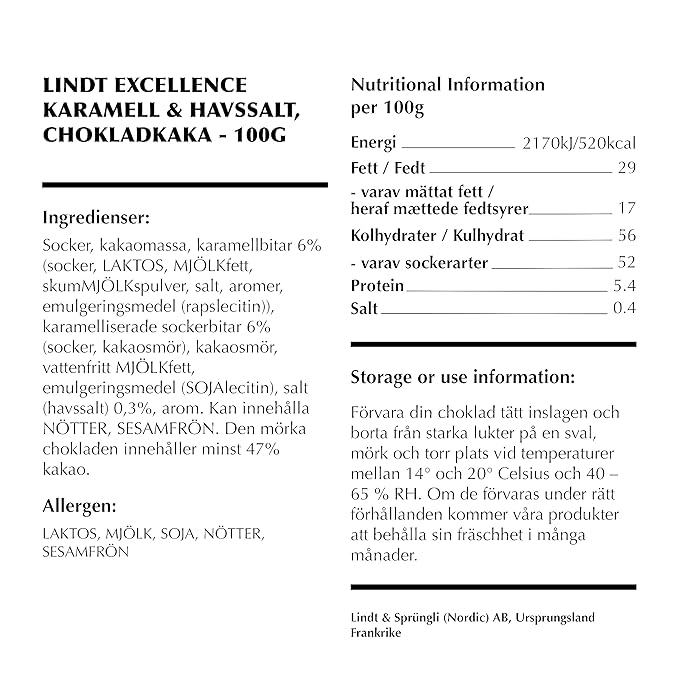 Description: Lindt EXCELLENCE Caramel with 47% cocoa is a beautiful dark chocolate with a delicate touch of sea salt and caramel. The caramel pieces give a nice crunchy sensation, while the sea salt enhances and rounds off the chocolate flavor. Enjoy Lindt EXCELLENCE Caramel with your afternoon coffee or when you simply need a little break and enjoy a symphony of cocoa while the chocolate melts on your tongue.