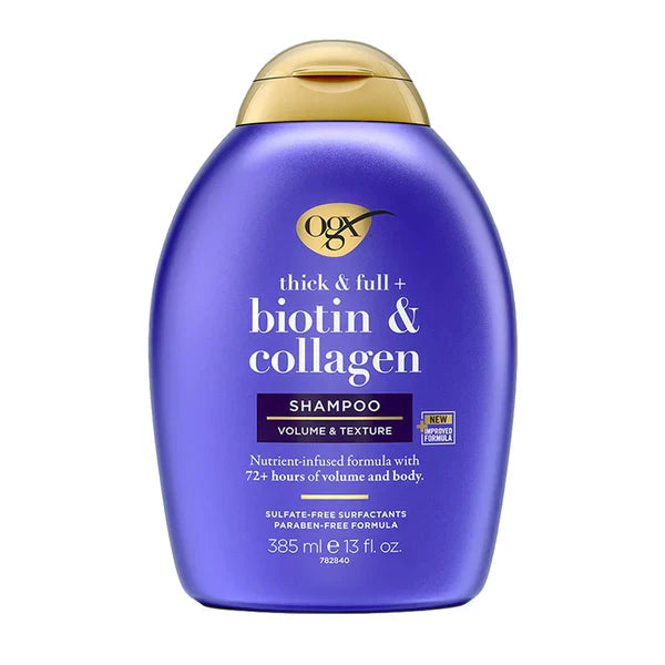 Product Overview: OGX Thick & Full Biotin & Collagen Shampoo is designed to give your hair a thicker, fuller look while nourishing and strengthening each strand. The formula is enriched with biotin, collagen, and hydrolyzed wheat protein to enhance hair's volume and thickness while promoting overall hair health.